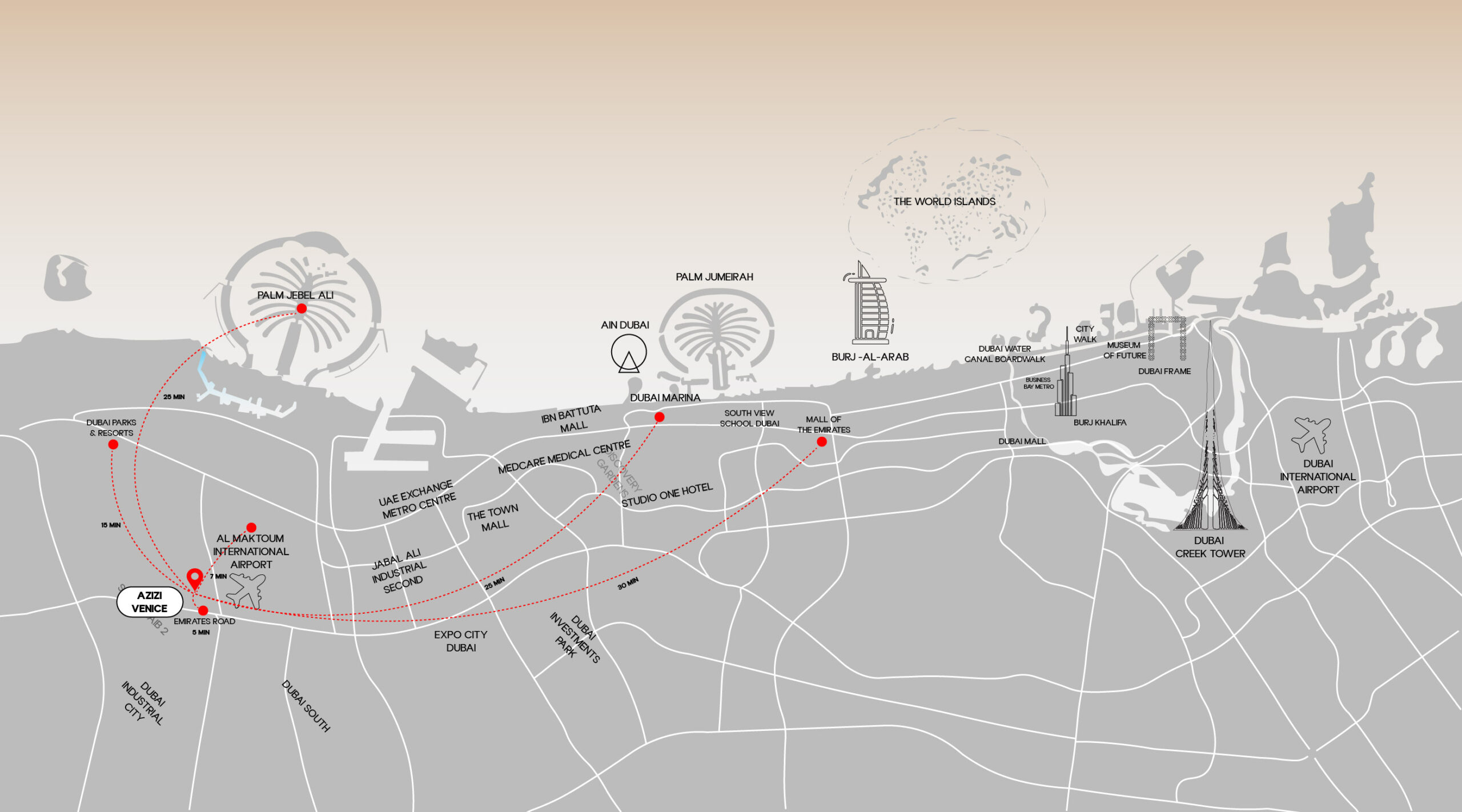 Located near Al Maktoum International Airport and the future metro station, Azizi Venice ensures easy access to key destinations across Dubai. The development also boasts a lively 700-meter retail boulevard, set to become a prime destination for shopping, dining, and entertainment. With excellent connectivity and a thoughtfully designed infrastructure, residents will enjoy both convenience and an engaging community atmosphere.
