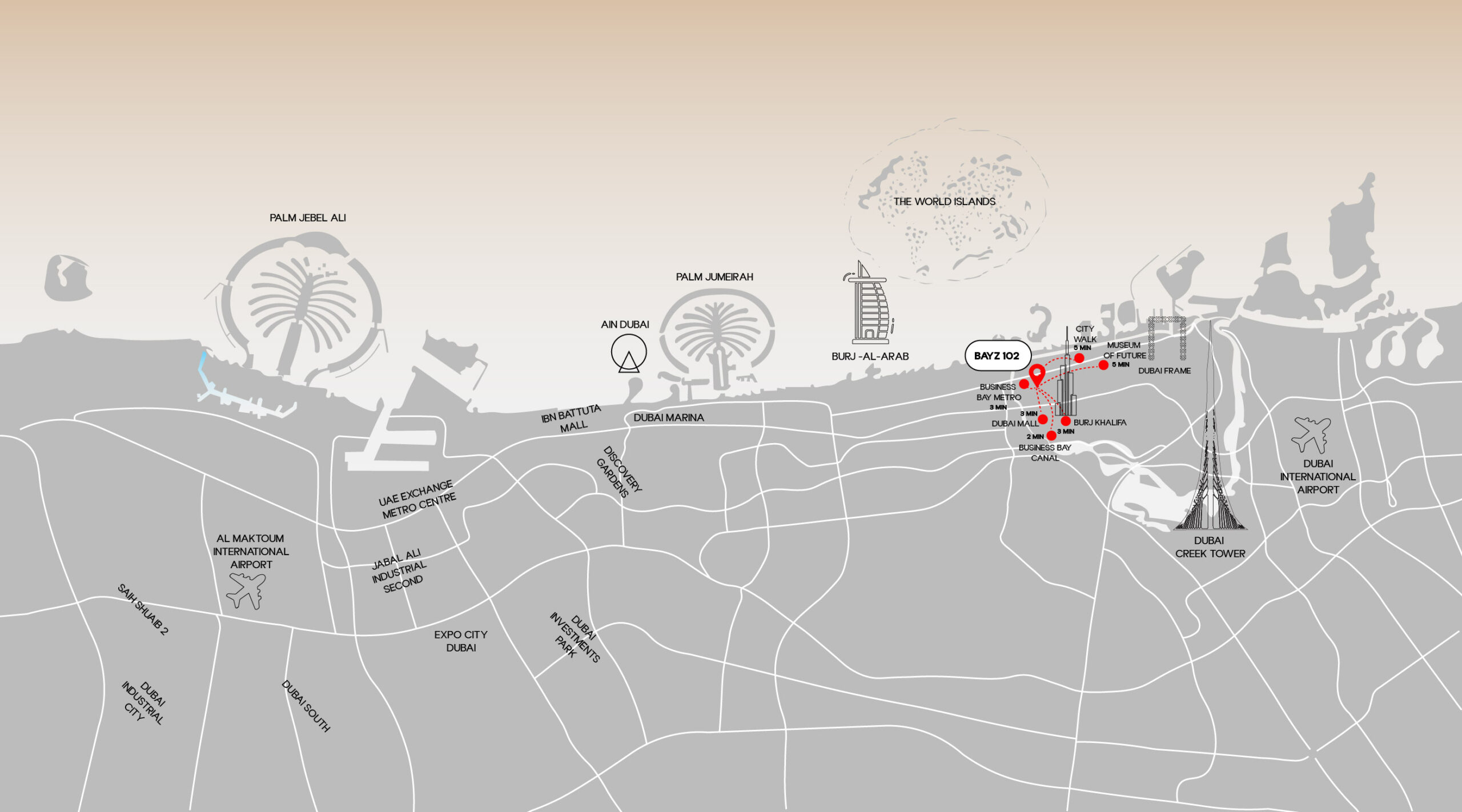 Situated in the heart of Business Bay, BAYZ 102 is just minutes from Sheikh Zayed Road and Business Bay metro station, ensuring easy access to all of Dubai. With world-class shopping, fine dining, and entertainment hubs nearby, this is an ideal destination for those seeking properties to buy in Dubai or apartments for rent in Dubai.