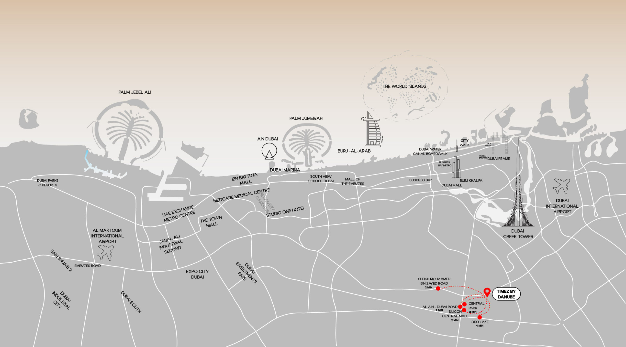 Located in one of Dubai’s top real estate hubs, Timez ensures seamless connectivity via Sheikh Mohammed Bin Zayed Road, providing quick access to Dubai International Airport, Dubai Mall, Burj Khalifa, and Dubai Creek Harbour. The community is near Silicon Central Mall, Dubai Safari Park, and top schools, making it ideal for professionals and families.